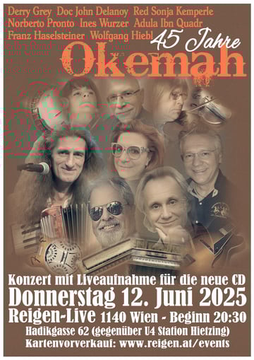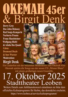 Das Okemah Jubiläumskonzert in Leoben im Stadttheater vom Freitag, 17. Oktober 2025 und auch die CD Präsentation (als Sextett!) im "Traditionsbeisl" Gasthaus zum Sieg in der Wiener Leopoldstadt (Derry's Stammlokal) vom 15. November waren ein voller Erfolg. Das Stadttheater Leoben war mit 250 Besuchern ausverkauft und das "Sieg" sozusagen "bummvoll".